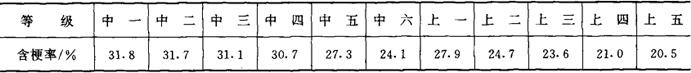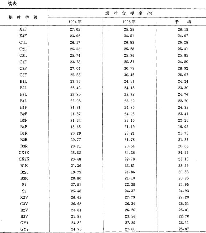 (2)烟叶的含梗率随烟叶类型、品种、部位、叶片形态和厚度等不同而异。表4-6-1、表4-6-2、表4-6-3和表4-6-4是烤烟和白肋烟的含梗率情况。