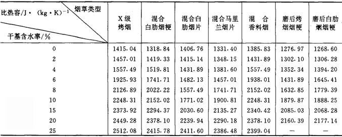 | 释义 | 烟叶的热物理特性 (一)烟叶的比热容 表4-6-17是各种烟叶在不同含水率情况下的比热容。图4-6-21、图4-6-22、图4-6-23、图4-6-24和图4-6-25是烟草比热容与含水率的关系。 表4-6-17 各种烟叶在不同含水率下的比热容