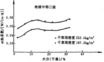 图4-6-32 中部三级烤烟热导率与含水率的关系 注:烤烟中部三级为:河南、湖南、安徽、东北、山东、云南、贵州7种中部三级烟丝的等比例混合物