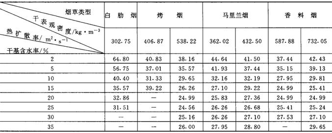 图4-6-25 烤烟烟梗比热容随含水率变化的曲线 注:烤烟烟梗为:河南、湖南、安徽、东北、山东、云南、贵州7种中部三级烟梗的等比例混合物 (二)烟叶的热扩散率 热扩散率与物料的热导率、比热容和密度之间具有如下的函数关系:
