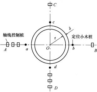 | 释义 | 烟囱施工放样 烟囱是典型的高耸构筑物,其特点是基础小、筒身高、抗倾覆性能差,其对称轴通过基础圆心的铅垂线,因而施工测量的工作主要是严格控制其中心位置,确保主体竖直。按施工规范规定:筒身中心轴线垂直度偏差最大不得超过110mm;当筒身高度H>100m时,其偏差不应超过0.05H%,烟囱圆环的直径偏差不得大于30mm。其放样方法和步骤如下: 1.烟囱基础施工测量 首先按照设计施工平面图的要求,根据已知控制点或原有建筑物与基础中心的尺寸关系,在施工场地上测设出基础中心位置O点。如图10-43所示,在O点上安置经纬仪,任选一点A作为后视点,同时在此方向上定出a点,然后,顺时针旋转照准部依次测设90°直角,测出OC、OB、OD方向上的C、c、B、b、D、d各点,并转回OA方向归零校核。其中A、B、C、D各控制桩至烟囱中心的距离应大于其高度的1~1.5倍,并应妥善保护。a、b、c、d四个定位桩,应尽量靠近所建构筑物但又不影响桩位的稳固,用于修坑和恢复其中心位置。