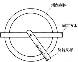 图10-43 烟囱基础定位放线图 然后,以基础中心点O为圆心,以r+δ为半径(δ为基坑的放坡宽度,r为构筑物基础的外侧半径)在场地上画圆,撒上石灰线以标明土方开挖范围。 当基坑开挖快到设计标高时,可在基坑内壁测设水平桩,作为检查基础深度和浇筑混凝土垫层的依据。 浇筑混凝土基础时,应在基础中心位置埋设钢筋作为标志,并在浇筑完毕后把中心点O精确地引测到钢筋标志上,刻上“+”字,作为筒体施工时控制筒体中心位置和筒体半径的依据。 2.烟囱筒身施工测量 (1)引测筒体中心线 筒体施工时,必须将构筑物中心引测到施工作业面上,以此为依据,随时检查作业面的中心是否在构筑物的中心铅垂线上。通常是每施工一个作业面高度引测一次中心线。具体引测方法是:先在施工作业面上横向设置一根控制方木和一根带有刻度的旋转尺杆,如图10-43所示,尺杆零端铰接于方木中心。方木的中心下悬挂质量为8~12kg的垂球。平移方木,将垂球尖对准基础面上的中心标志,如图10-44所示,即可检核施工作业面的偏差,并在正确位置继续进行施工。