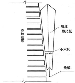 图10-44 旋转尺杆 筒体每施工10m左右,还应向施工作业面用经纬仪引测一次中心,对筒体进行检查。检查时,把经纬仪安置在各轴线控制桩上,瞄准各轴线相应一侧的定位小木桩a、b、c、d,将轴线投测到施工面边上,并作标记,然后将相对的两个标记拉线,两线交点为烟囱中心线。如果有偏差,应立即进行纠正。 对高度较高的混凝土烟囱,为保证精度要求,可采用激光经纬仪进行烟囱铅垂定位。定位时将激光经纬仪安置在烟囱基础的“+”字交点上,在工作面中央处安放激光铅垂仪接收靶,每次提升工作平台前和后都应进行铅垂定位测量,并及时调整偏差。 (2)筒体外壁收坡的控制 为了保证筒身收坡符合设计要求,除了用尺杆画圆控制外,还应随时用靠尺板来检查。靠尺形状如图10-45所示,两侧的斜边是严格按照设计要求的筒壁收坡系数制作的。在使用过程中,把斜边紧靠在筒体外侧,如筒体的收坡符合要求,则垂球线正好通过下端的缺口。如收坡控制不好,可通过坡度尺上小木尺读数反映其偏差大小,以便使筒体收坡及时得到控制。