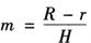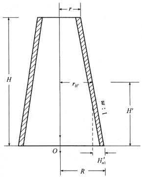 图10-45 靠尺板示意图 在筒体施工的同时,还应检查筒体砌筑到某一高度时的设计半径。如图10-46所示,某高度的设计半径rH′可由图示计算求得。 rH′=R-H′m 式中 R——筒体底面外侧设计半径; m——筒体的收坡系数。 收坡系数的计算公式为: