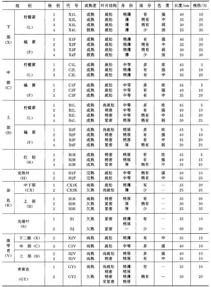 3.加拿大烤烟分级 先按部位分为上部、中部、下部三个组,再按颜色分柠檬黄和淡橙黄、橙黄和淡棕黄、深棕黄、杂灰、带青柠檬黄和淡橙黄、带青橙黄和棕红黄、樱桃红七组,每组按品质因素分成1~6个等级,共计79个等级。 (三)我国烤烟分级标准简介 根据国外分级经验,结合国内实际,对烟叶进行部位和颜色分组后,再按品质因素(烟叶成熟度、叶片结构、身份、长度等)档次进行等级划分。烟叶残伤程度作为分级的限制因素进行控制。 1.原有烤烟15级制分级标准(GB2635-86) 见表4-1-21。 表4-1-21 我国原有烤烟分级(15级制)标准