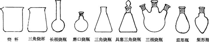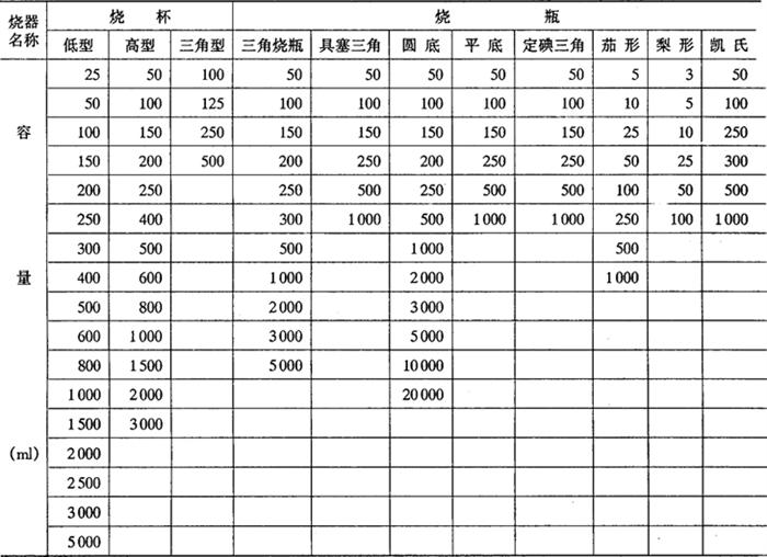 玻璃烧器有烧杯和烧瓶两大类(见图11-4和表11-5),烧杯有高型、低型和三角型三种,而平时人们常说的烧杯一般都指的是低型烧杯。烧瓶的种类更多,其中三角烧瓶、圆底烧瓶、圆形平底烧瓶、二口烧瓶、三口烧瓶、茄形烧瓶、梨形烧瓶等是实验室中常见的。烧瓶的瓶口有普通和磨砂口之分,标准磨砂口的烧瓶能和其他具有标准磨砂塞的玻璃仪器方便的连接,组成各种仪器系统,如蒸馏系统、回流系统、反应系统等等。