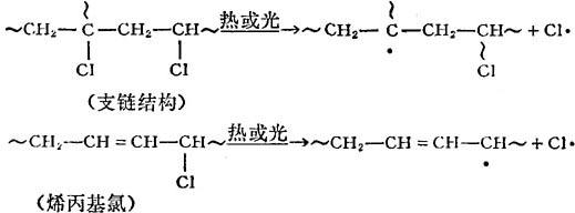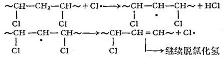 在形成的自由基引发下,聚氯乙烯按链式机理发生脱氯化氢降解: