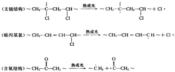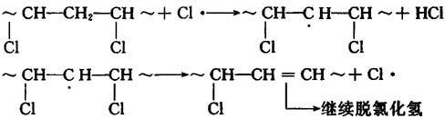 在形成的自由基引发下,聚氯乙烯按链式机理发生脱氯化氢降解: