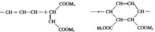使用硫醇盐型有机锡稳定剂时,不稳定氯原子是被硫醇基所置换。该类稳定剂还可捕捉氯化氢生成氯化锡化合物(R2SnCl2),虽然也具有路易斯酸的性质,但与CdCl2不同,不促进聚氯乙烯的分解。此外,捕捉氯化氢所生成的硫醇酸酯(HSCH2OCOR)可与双键发生加成反应,破坏共轭多烯结构。 (3)不饱和酸的盐或酯 由不饱和酸形成的热稳定剂中含有双键,它可与聚氯乙烯分子中的共轭双键发生双烯加成反应,从而破坏共轭结构,抑制变色。以马来酸盐为例,反应如下: