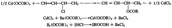 (4)钡镉复合稳定剂 钡皂和镉皂并用有协同效应。镉皂有较强的置换不稳定氯原子的能力,但生成的氯化镉有促进聚氯乙烯脱氯化氢的作用。钡皂可以把氯化镉再生为镉皂,而且还可与放出的氯化氢反应,进一步抑制聚氯乙烯的降解。反应过程如下: