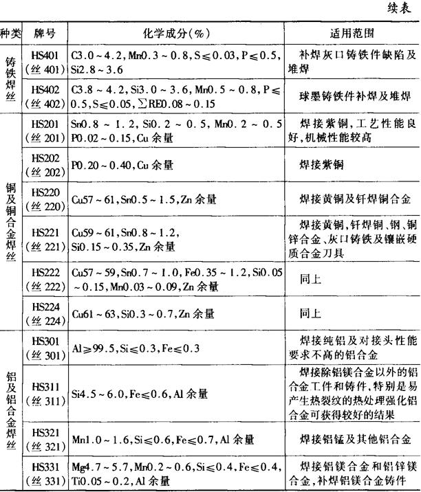 焊丝的化学成分和液态流动性直接影响焊缝金属的机械性能和焊缝成形,一般应根据母材的化学成分来选择焊丝。常用焊丝牌号、化学成分及用途见表12-11。