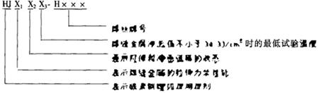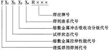 国标GB/T5293-1999颁布时间不长,该标准的前身GB5293-85《碳素钢埋弧焊用焊剂》中焊剂型号是根据埋弧焊焊缝金属的力学性能来划分的。焊缝金属的力学性能与所配用的焊丝有关,所以焊剂型号以与其匹配的焊丝组合表示,其表示方法如下[6,7]: