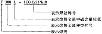 举例:F5121-H08MnMoA,表示这种低合金钢埋弧焊用焊剂采用H08MnMoA焊丝,按GB12470-90规定的工艺参数焊接试样,经焊后热处理的熔敷金属抗拉强度为480~650MPa,屈服强度不低于380MPa,伸长率不低于22.0%,在20℃时V形缺口冲击吸收功不小于27J,焊剂渣系为氟碱型。 (3)埋弧焊用不锈钢焊剂的型号 根据GB/T17854-1999的规定,埋弧焊用不锈钢焊丝和焊剂的熔敷金属中铬含量应不大于11%,镍含量应小于38%;焊丝和焊剂的型号分类是根据焊丝-焊剂组合的熔敷金属化学成分、力学性能进行划分。 首字母“F”表示焊剂;“F”后面的数字表示熔敷金属分类代号,有特殊要求的化学成分,该化学成分用元素符号表示,放在数字的后面;“-”后面表示焊丝的牌号。 不锈钢埋弧焊焊丝-焊剂型号举例: