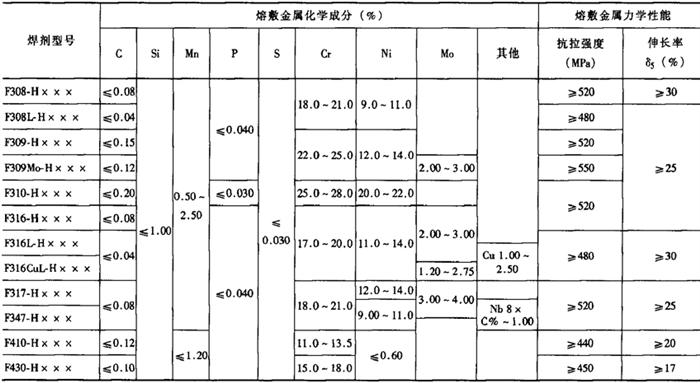 表1-3-10规定了各种埋弧焊用不锈钢焊剂的熔敷金属化学成分和力学性能。 表1-3-10 埋弧焊用不锈钢焊剂的熔敷金属化学成分和力学性能