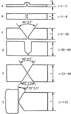 图10-29 20g汽包焊接工艺设计 (一)焊缝及接头形式的确定 1.焊缝基本形式的选择 焊缝是构成焊接接头的主体部分,其基本形式有对接焊缝和角接焊缝。选择时,应根据焊件受力状态确定。 (1)对接焊缝:热影响区小,应力分布比较合理,除特殊要求外,一般多采用对接焊缝,尤其是重要受力焊缝应尽量选用,并根据板材厚度,适当选取对接焊缝的焊接边缘六种对接形式,如图10-30所示,图10-30a为卷边对接,10-30b为平面对接,10-30c~f分别为V形、U形、X形和K形开坡口对接,各种坡口尺寸可根据国家统一标准GB985-80和GB986-80或具体情况确定。
