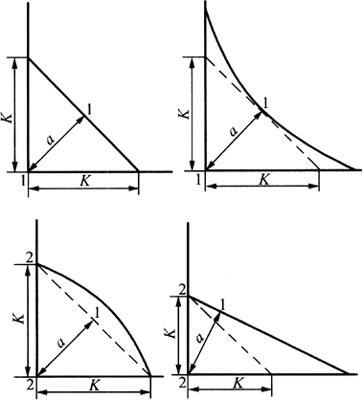 图10-30 对接焊缝典型坡口形式(单位:mm) a.卷边对接 b.平面对接 c.V形对接 d.U形对接 e.X形对接 f.K形对接 选择坡口形式时,应首先考虑到焊接变形和焊接材料的消耗量。对于同样厚度的焊接接头,采用X形坡口比V形坡口受热均匀,变形小,并能节省较多的焊接材料、电能和工时,构件越厚节省的越多。其次,还要考虑到焊件的可焊到性,对于不能翻转的和内径较小的容器,转子及轴类的对接焊缝,为了保证可焊到性和便于施焊,必须采用V形或U形坡口才能保证焊接质量。同时,还应考虑到坡口加工的手段及难易程度,V形和X形坡口既可用气割或等离子切割,又可用机械切削加工,但U形和双U形坡口,一般需用刨边机或铣床加工。 (2)角接焊缝:角接焊缝受力分布比对接焊缝复杂,但其承载能力高,承受动载效果好,是一种应用最广泛的焊缝,尤其是接头成直角或一定角度连接时,必须采用这类焊缝,并且根据接头处两部分的厚度差别和受力情况,可选择适当截面形状的角接焊缝。角接焊缝的四种截面形状如图10-31所示。