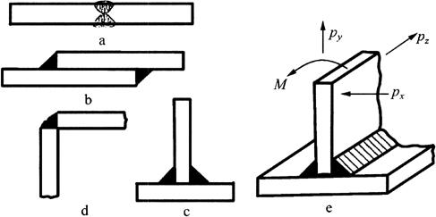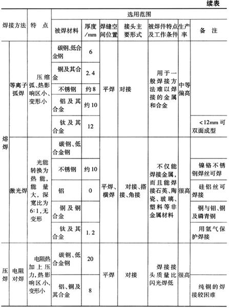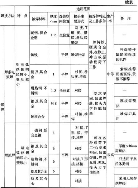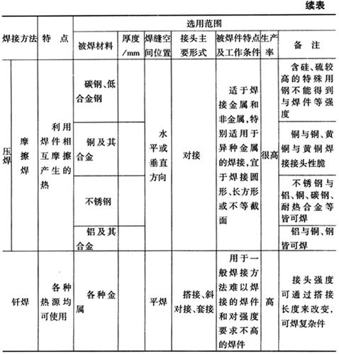 图10-32 焊接接头的基本形式 a.对接接头 b.搭接接头 c.T形接头 d.角接头 e.T形接头承载能力 (1)对接接头:从力学角度看是比较理想的接头形式,在焊接结构上和焊接生产中,常见的对接焊缝方向是与载荷方向垂直的对接接头,承载能力强,施焊方便,一般多采用这种接头形式(10-32a)。 (2)搭接接头:由于搭接接头的两工件不在同一平面上,应力分布不均匀,疲劳强度较低,受力时将产生附加弯矩,而且金属消耗量也大,不是焊接结构的理想接头,一般应避免采用。但是搭接接头不需开坡口,装配尺寸精度要求不高,其横向收缩量也比对接接头小,所以在结构中仍得到广泛的应用。例如某些受力不大的平面连接与空间结构,以及异种金属的连接件等,都可采用搭接接头(图10-32b)。 (3)T形接头:T形接头是由相互垂直的被连接件用角焊缝连接起来的接头(图10-32c),能承受各种方向的力和力矩(图10-32e),承载能力比对接接头更强,是最理想的电弧焊接头,对于较厚的板,可根据受力情况开K形坡口(图10-30f),确保焊透。 (4)角接头:角接头多用于箱形构件上,常见的有简单角接头(图10-32d)、双面焊缝从内部加强角接头和开坡口的角接头等形式。一般在其承载能力许可的条件下,可考虑省工时、最经济的简单角接头。 关于接头静载强度的计算,可查阅有关专业书或手册。 (二)焊接方法的选择 常用的焊接方法很多,每种方法都有其适用范围。选择时应根据材料的可焊性、焊件形状和尺寸、生产批量及使用要求等综合考虑后,参照表10-9确定。 表10-9 常用焊接方法的选用
