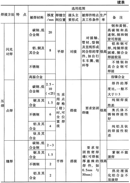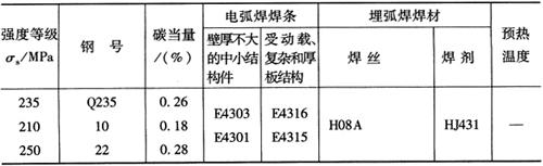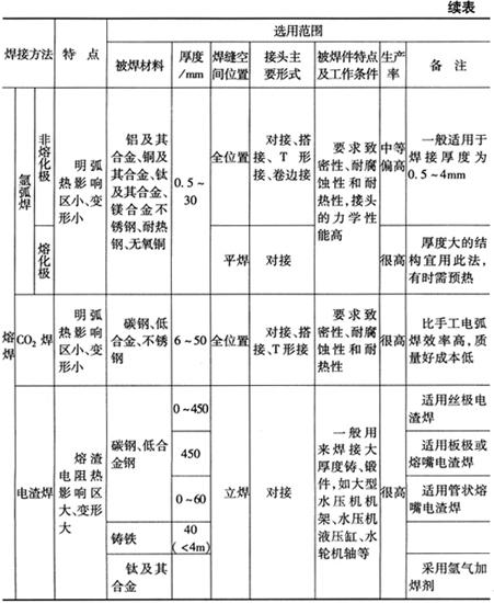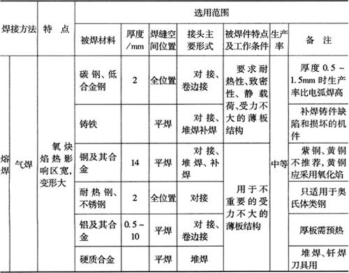 1.低碳钢和低合金钢焊接方法的选择 由于这两类钢的焊接性能良好,几乎可用所有的焊接方法。其中,对于焊缝无密封要求的薄板结构可采用点焊,有密封要求的薄壁容器可采用缝焊;对于焊缝短且处于不同空间位置或单件小批量生产的构件,可采用焊条电弧焊,它不仅设备简单、操作方便、灵活,而且还可以焊接板厚为2mm以上的各种金属结构件。 对于板厚为6~30mm的中等厚度焊件,则采用焊条电弧焊、埋弧焊或气体保护焊,尤其是气体保护焊,高效、节能、成本低、变形小,是最佳的焊接方法。但氩气成本较高,一般不必采用氩弧焊。 同时,对于大批量的长直焊缝和环焊缝,可采用埋弧自动焊;对于为35mm以上的大厚件、大截面的轴及环形件则采用电渣焊,可以小拼大,实现以焊代锻,以焊代铸的工艺方法。 2.合金钢、不锈钢和有色金属焊接方法的选择 合金钢、不锈钢和有色金属等重要焊件,应采用氩弧焊易保证焊接质量,其中铝合金和黄铜焊件,在单件生产或无氩弧焊设备时,也可采用气焊。气焊不仅适于焊接有色金属件,还可焊接低碳钢薄板,焊补铸件和火焰钎焊,以及局部加热矫正变形和局部热处理等。 3.稀有金属和高熔点金属焊接方法的选择 稀有金属和高熔点金属的焊件,一般厚度时可采用等离子弧焊接、真空电子束焊接或窄间隙脉冲氩弧焊,而微型箔件则应选用微束等离子弧焊或脉冲激光点焊。 (三)焊接填充材料的选择 焊接材料包括焊条、焊丝和焊剂等,种类很多,各有其适用范围,如表10-10和表10-11所示。 表10-10 低碳和低合金结构钢的焊接材料选择