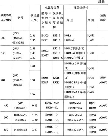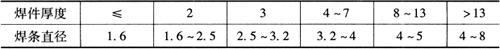 选择的是否恰当将直接影响到焊接质量和经济效益。通常不仅应根据焊件的化学成分、力学性能、抗裂性能、耐腐蚀性以及高温性能等要求,还应根据焊接结构形状、工作条件、受力情况和焊接设备等方面进行综合考虑,选择相应的焊接材料种类、型号及牌号。 1.根据焊件力学性能选择焊接材料 结构钢焊件的焊接材料主要依据焊缝金属的强度、塑性和韧性等不同要求分析选择。 2.依据钢材的强度等级选择相应焊接材料 (1)低碳和低合金结构钢的焊接:为保证焊缝与母材的力学性能相同,在选择焊接材料时,应根据母材抗拉强度,按“等强”原则选择相同强度等级的焊接材料,例如Q235A和16Mn等一般结构件,可选用E4303、E5015焊条或H08A和H08MnA焊丝配HJ431焊剂。 (2)低合金中强钢的焊接:如15MnTi和15MnVN等,不仅要求选用相应强度等级的碱性低氢型焊条E5516、E5515或碱度高的焊剂HJ350配H08Mn2SiA和H08MnMoA焊丝,还要求烘干焊条和焊剂,清理工件,调整焊接规范,控制热影响区的冷却速度,焊前预热至100~150℃,焊后及时加热到200~350℃,保温2~6h进行消氢处理,同时进行消应力处理。 3.依据母材的塑性和韧性要求选择相应焊接材料 (1)中碳钢和结构受力复杂的低合金高强钢的焊接:如45钢和25CrMnSi、14MnMoVB等,若要求塑性好、冲击韧性高、低温性能好、抗裂能力强的结构件,可选用塑性好的碱性低氢型焊条E6016-D1或碱度高的焊剂HJ250配合H08Mn2MoVA焊丝。 (2)铸铁焊补:为防止产生白口组织和裂纹,焊缝便于机加工,可选用塑性和抗裂性好的纯镍或镍合金基焊芯的铸铁焊条进行焊补,如灰口铸铁薄壁件或加工面的焊补,可选用JBTZNi-8(Z308)焊条;灰口铸铁重要面及球墨铸铁面的焊补,可选用JBTZNiFe-8(Z408)焊条。 4.依据焊件化学成分选择相应成分的焊接材料 不锈钢、耐热钢和有色金属材料的焊接,要根据焊件的化学成分选择焊接材料。 (1)不锈钢的焊接:根据工件的工作温度、腐蚀介质合理选用与母材成分相近的焊接材料。对于一般腐蚀要求不高的18-8型不锈钢,可选取E0-19-10-16(A102)或E0-19-10-15(A107)焊条。 对工作温度低于300℃而要求耐腐性能较高的18-8型不锈钢,可选取E0-19-10Nb-16(A132)或E0-19-10Nb-15(A137)焊条。 对于要求抗硫酸、有机酸等腐蚀的18-12-Mo2型不锈钢,可选取EO-18-12Mo2-16(.A212)或E0-18-12Mo-16(A022)焊条;对于高温抗氧化性好的25-13、25-20型不锈钢,可选取E1-23-13-16(A302)或E1-23-13-15(A307)焊条。同时,对于要求耐磨和抗腐蚀的马氏体不锈钢2Cr13,可选取E2-26-21-16(A402)或E2-26-21-15(A407)焊条。 不锈钢埋弧自动焊或氩弧焊时,可选用相应成分的不锈钢焊丝,如18-8型不锈钢埋弧焊,可选用HOCr22Ni10焊丝配合HJ260碱性低氢焊剂;氩弧焊可选用HOCr19Ni9Ti。 (2)耐热钢的焊接:对于在高温(<600℃)和腐蚀较轻的介质中工作的珠光体耐热钢件焊接,如15CrMo和2.25Cr-1Mo,应选用E5515-B2(R307)、E6000-B3(R400)和E6015一B3焊条,或相应成分的铬钼钢焊丝配合HJ251焊剂,并且氩弧焊时,应选用保证焊缝成分与焊件成分相同类型的焊丝。焊前须预热250~350℃,焊后回火720℃左右。 (3)有色金属的焊接:焊条电弧焊焊接铜及铜合金时均采用低氢型焊条,纯铜焊接可选用TCu焊条,铜硅合金可选用TCuSi焊条,铜铝合金可选用TCuAl焊条。氩弧焊时,纯铜可选用JBSCu-2焊丝,黄铜可选用JBSCuZn-2或JBSCu-3焊丝。 焊条电弧焊焊接铝及铝合金时,均采用盐基型焊条,纯铝焊接可选用TAl焊条,铝锰合金可选用TAIMn焊条。氩弧焊时,纯铝可选用HS301(JBSAI-3)焊丝,铝锰合金LF21可选用HS321,铝镁合金LF5可选用HS331焊丝,硬铝LY16和锻铝LD2可选用HS311(JBSAlSi-5)焊丝。 如果焊件材料含S、P等杂质较高时,也同样必须选用抗裂性较好的碱性低氢焊条或焊剂。 5.依据焊件的使用性能和工作条件选择相应焊接材料 当焊件的工作条件很恶劣,如工作在动载荷、冲击载荷或工作在高温高压情况下,对于所用焊接材料在冲击韧性、塑性方面的要求均应很严格。焊接这些重要的结构时,应该选用冲击韧性、延伸率、强度都较高的碱性低氢型焊条或焊剂。 例如20、25等优质低碳钢,对于在工作条件一般的焊接结构,可选用E4303和E4301等酸性焊条,而对于工作在受冲击、振动等重要的焊接结构则应当采用E4316、E4315和E5016等碱性低氢型焊条。 当焊件在腐蚀性介质中工作时,应根据介质的种类、浓度、温度等情况,正确选择出相应的耐腐蚀性焊接材料(表10-10)。 (四)焊接工艺参数的确定 1.焊条电弧焊工艺参数的确定 确定焊条电弧焊的工艺参数主要是选择焊条直径、焊接电流、电弧电压、焊接速度和层数,即确定焊接规范。焊接规范对于焊接生产率和焊接质量有很大的影响,因此,必须正确选择。 (1)焊条直径:焊条直径的选择主要根据焊件厚度、接头形式、焊缝位置及焊接层数等选择。厚度愈大,要求焊缝尺寸也愈大,就需要选用直径大一些的焊条,表10-12为平焊对接时焊条直径的选择。 表10-12 焊条直径的选择(mm)