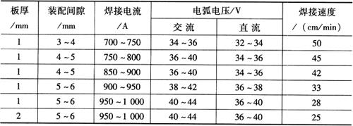 式中 t——工件厚度(mm); d——焊条直径(mm)。 (4)电弧电压和焊接速度的掌握:在保证焊透且焊缝成型良好的前提下,应尽量快速施焊,焊件越薄,焊速应越快。 电弧电压主要决定于弧长,一般弧长控制在1~4mm,相应的电弧电压在16~25V。电弧过长会引起电弧不稳定,金属飞溅,焊缝成型不良及产生气孔等。 2.埋弧焊工艺参数的确定 埋弧焊的主要工艺参数有电弧电压、焊接电流、焊丝直径、焊接速度和焊丝伸出长度等,选择这些参数的原则是:电弧稳定、焊缝形状和尺寸符合要求,表面成型好,无缺陷。 由于焊接电流增大,可使焊缝的熔深和加强高显着增加,而电弧电压升高却使焊缝熔宽增加,熔深和加强高略有减小,出现未焊透和咬边等。同时,增大焊接速度,弧热减小,熔深减小,加强高及缝宽也减小,过分地增大焊接速度,会造成焊缝未焊透,边缘未焊合等;增加焊丝直径,弧热范围增加,缝宽增加,熔深稍微减小。 因此,应正确选择各工艺参数,若采用Ⅰ形坡口对接的单面焊双面成型工艺,其工艺参数可参考表10-14选择,至于双面焊和T形接头角焊缝“水平”位置焊接工艺参数可查阅有关专业手册选择。 表10-14 在焊剂垫上对接接头单面埋弧焊接的工艺参数