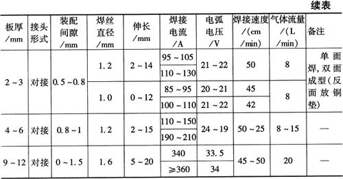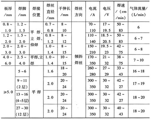 注:焊丝直径均为5mm。 3.CO2汽体保护焊工艺参数确定 由于CO2气体保护焊的保护介质来源丰富、价廉,且电流密度大、生产效率高,广泛应用于中等厚度以下的低碳钢和低合金钢的焊接。其主要工艺参数有电弧电压、焊接电流、焊接速度、气体流量及焊丝直径等,其对接平焊的工艺参数可参照表10-15,而角焊缝的工艺参数可参照表10-16选择。 表10-15 钢的CO2气体保护电弧焊平焊焊接条件