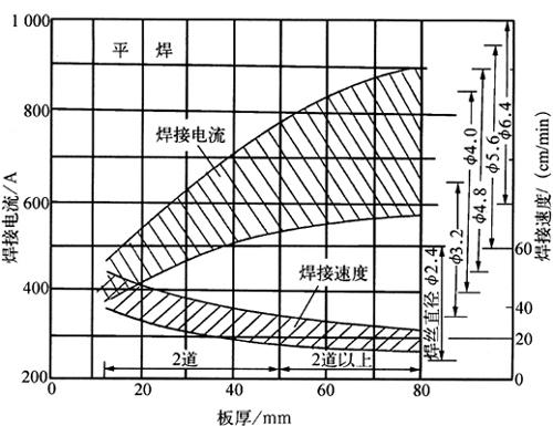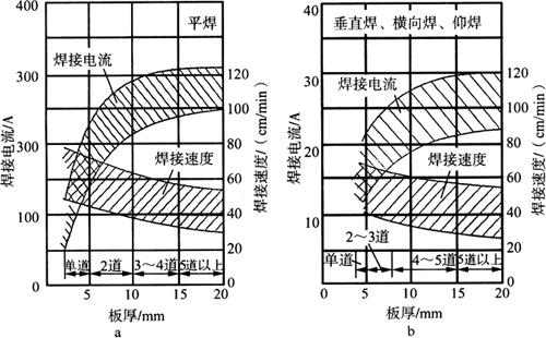 应当指出,上式只是一个大概的焊接电流范围,在实际施焊时,还要考虑焊件厚度、焊缝位置、接头形式、施焊环境温度等因素,一般通过试焊或经验来确定。当然过大的焊接电流易使药皮失效或烧穿工件,太小则会焊不透,且生产率低。 (3)焊接层数的选择:在焊件厚度较大时,考虑到焊缝厚度对金属塑性和焊缝质量的影响,往往需要采用多层焊,每层厚度最好不大于4~5mm。经验认为,每层的厚度等于焊条直径的1.2倍时,生产率较高,并且比较容易操作。因此,可近似计算如下: