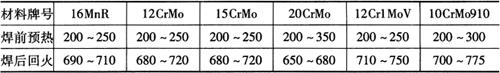 注:含钒低合金钢在600~620℃回火后塑性、韧性下降,热处理温度宜选在550~560℃。 3.珠光体耐热钢的焊接热处理规范 珠光体耐热钢的焊接热处理规范如表10-18所示。 表10-18 珠光体耐热钢焊前预热和焊后回火温度(℃)
