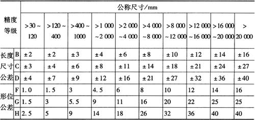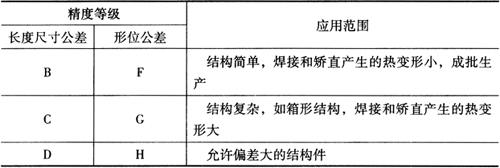 4.焊接结构件尺寸与形位公差的选用 JB/ZQ4000.3-85对焊接结构件的尺寸与形位公差等级要求如表10-19所示,并将规定的其公差数值列于表10-20。 表10-19 尺寸与形位公差等级