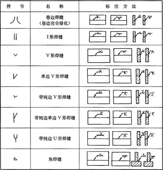 注:①各种坡口参见GB985-1988,GB986-1988;焊缝符号见GB324-1988。 ②本表适于碳钢、低合金钢的手弧焊与气焊。 *卷边坡口焊时烧平。 2.焊缝符号在图样上的标注(GB324-88) 见表7-15、表7-16、表7-17、表7-18、表7-19。完整的焊缝表示方法除基本符号、辅助符号、补充符号以外,还包括指引线、一些尺寸符号及数据。指引线一般由带有箭头的指引线(简称箭头线)和两条基准线(一条为实线,另一条为虚线)两部分组成,如表7-14~表7-18示例。而焊缝横截面上的尺寸标在基本符号的左侧;长度方向的尺寸标在基本符号的右侧;坡口角度、坡口面角度、根部间隙等尺寸标在基本符号上侧或下侧,见图7-8。如在基本符号右侧无任何标注或说明时,表示焊缝在工件全长上连续;左侧若无任何标注或说明时,表示施焊时要完全焊透。 表7-15 常用焊缝基本符号及标注方法