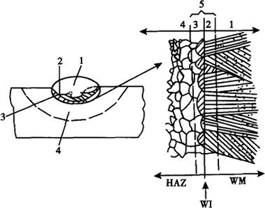 图1-2 熔合区构成示意图 1-焊缝区(富焊条成分);2-焊缝区(富母材成分);3-半熔化区;4-真实HAZ;5-熔合区;WI-实际熔合线(焊缝边界) 焊接接头的性能,通常应包括焊缝、熔合区、热影响区三部分的性能,在检验焊接接头的力学性能时常常需要单独测试焊缝、熔合区和热影响区的性能。 |