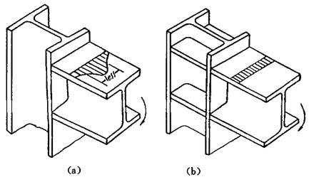 图11-114 工字钢的连接 (a)不加筋板,应力分布不均,承载能力差(b)加焊筋板,应力分布均匀,承载能力提高