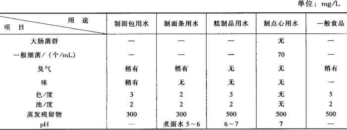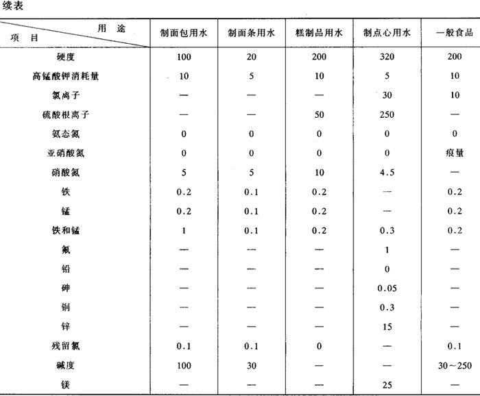 | 释义 | 焙烤食品用水的选择与处理 (一)面包用水的选择 面包生产用水必须符合GB 5749-1985《生活饮用水卫生标准》。在实际生产中面包用水的pH略小于7为好,一般pH为5~6;水的硬度以中等硬度上下最为适宜,即硬度在2.9~4.3mmol/L(8~12°d)。 硬度过高的水对酵母有害,面包容易老化,且使面筋过于强韧。这就需要增加酵母用量或补充麦芽浸出汁来改善,或者添加醋酸、乳酸等酸性物质,使硬度的影响减小。 如果硬度不足应当予以补充,通常使用硫酸钙、磷酸钙等钙盐,但用量一定要与水的本身硬度相配合。中等硬度水使操作时的面团物理性能良好,贮气性及烘焙弹性优异,面包瓤心的纹理组织、触感及色泽比较优异。 (二)方便面用水的选择 先进的制面工艺要求使用硬度在0.36~0.71mmol/L(1~2°d)的极软水。但是我国各地的自来水一般都未经软化处理,其硬度在8.9mmol/L(25°d)以下,属于硬水范围,对制面工艺和面条质量肯定是有影响的。 油炸类膨化食品用水,其总硬度应在50mg/kg以下(以CaCO3计),铁、铜在0.1mg/kg以下,以减缓油炸油劣化速度。 表1-2-28列出了日本食品工业用水所需要的水质指标。 表1-2-28 食品工业用水所需要的水质指标(日本标准)