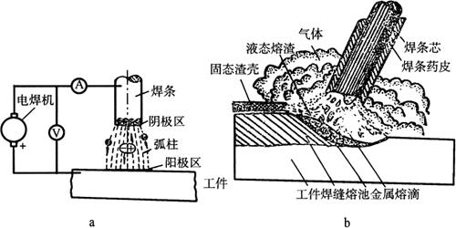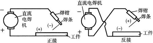 图10-1 焊缝成型过程 a.焊接电弧 b.焊接冶金 焊条与焊件接头处在电弧热作用下被迅速熔化形成熔池。随着电弧沿焊接处向前移动,新的熔池不断产生,而留在电弧后面的熔池金属开始冷却凝固形成焊缝(图10-1b),从而将被焊工件连接成整体。 2.电弧的极性及选用 由图10-1可见,焊接电弧可分为三个区域,即阳极区、弧柱区和阴极区。阳极区和阴极区的温度因电极材料的熔点不同而不同。用钢焊条焊接时,阳极区温度为2600K,阴极区温度为2400K,电弧中心区温度可达5000~8000K。 由于电弧产生的热量在阳极和阴极上有一定差异,因此在使用直流电焊机焊接时,有正接和反接两种接线方法(图10-2)。正接是将工件接正极,焊条或电极接负极,所产生的直流电弧可用于焊接厚钢板件、不锈钢、耐热钢等材料,以及钨极氩弧焊和等离子切割;而反接则是将工件接负极,焊条或电极接正极,多用于焊接薄钢板件及CO2气体保护焊和熔化极氩弧焊等。