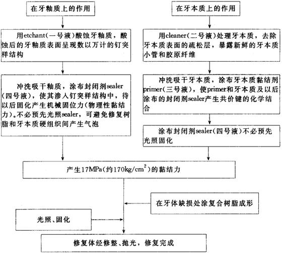 图28-1 gluma黏结系统的使用方法和作用机理 光凝单组分复合体修复 改进传统玻璃离子临床品质是多年来口腔修复材料的研究方向之一,而目标是以达到最新复合树脂材料的操作性和美观性。Dentsply(登士柏公司)最新研制开发成功的单一成分光凝复合体材料Dyract是一种崭新的复合材料,它综合了传统玻璃离子与复合树脂的很多性能优点,使用时既简便又可随意控制光凝系统,是当前比较先进的一种修复材料。 【材料特点】 (1)与牙齿有黏结性,且生物相容性好。 (2)牙体预备要求不严,只要能去尽腐质即可,不必制备抗力固位型,也不需预防性扩展。 (3)无需酸蚀处理,隔湿要求不如复合树脂修复严格,无吸唾装置也可进行操作。 (4)单一组分,无需调拌,不粘器械,操作方便。 (5)操作步骤少,省时间,工作效率高。 (6)色泽与透光性均佳,美观效果好。 (7)采用光凝体系,易于控制,固化后可立即精修、抛光。 (8)充填后材料能缓慢释放出氟离子,1年后仍继续有氟释放,有利于预防继发龋。 由于Dyract是一种最新开发出来的产品,与传统的玻璃离子和复合树脂在材料的组成、反应机理、与牙齿的黏结情况、材料的氟离子释放、物理性能、使用方法及注意事项等方面都明显不同。现将这方面的情况做简单介绍,以便在临床工作中能科学合理地使用这种新型材料,取得理想的临床效果。 【材料组成】 Dyract由修复材料与黏结底漆两部分组成为单一组分系统。 (1)修复材料为单组分光凝树脂基质材料,含有以下几种成分: ①UDMA树脂,组织相容性好。 ②TCB树脂,是Dyract创新性能的重要成分,由丁烷四羧酸与羟乙基甲基丙烯酸酯起反应形成的新的双功能单体,每1个单位分子含有2个甲基丙烯酸酯原子团与2个羧基。一方面它能像甲基丙烯酸酯一样于引发聚合时交联;另一方面,如果水与金属阳离子存在,它能起酸-基反应而生成盐。 ③锶氟铝硅酸盐玻璃,其重量占Dyract组成的72%,它被精细粉碎成直径平均为2.5μm大小的颗粒,作为填料,这种填料颗粒含有13%(重量)的氟化物。 ④引发剂,引发聚合,与复合树脂的光凝系统基本相同。 ⑤稳定剂,保证材料自身的寿命,防止自行聚合。 (2)黏结底漆(Dyract-PSA Prime/Adhesire),为瓶装挥发性很大的液体,内含: ①Penta,它是能与牙齿的无机部分形成离子键结合的重要成分。 ②TGDMA合成树脂,它决定着在不同单体中的交联水平。 ③Elastomeric resin合成的弹性树脂,它决定着黏结底漆固化后的弹性。 ④引发剂,同前述材料。 ⑤稳定剂,同前述材料。 ⑥丙酮作为一种高效溶剂,其作用是湿润牙釉质和穿透牙本质表面。 【材料反应机理】 开始阶段为光凝反应,其反应机制与光凝复合树脂相同。UDMA与TCB中可聚合分子以三元状相互联结,并通过包绕填料颗粒而加强。由于Dyract系无水配方,此阶段的TCB分子的羧基仍然维持不活动,没有发生离子交换反应。 第二阶段,已经聚合的材料在口腔环境中吸收水分,发生离子的酸-基化学反应,引起基质的进一步交联。这种水分吸收可以持续数月,直至整个材料达到3%的水分含量,这时Dyract材料自身含有引发离子酸-基反应所必需的成分。TCB分子中羧基引起金属阳离子从反应性的硅酸盐玻璃中释放出来,并最终导致在复合体的树脂结构中形成水凝胶。应该强调说明的是Dyract是光凝材料,单凭其自身酸-基反应不足以使糊剂硬固。 【与牙齿黏结】 (1)要想达到长期与功能性的修复,充填材料与牙齿硬组织之间应有牢固的黏结。Dyract的组成在某种程度上与传统的玻璃离子体相同,其高分子的电解质可与不经酸蚀的牙釉质和牙本质黏结,它是通过材料的功能性亲水性羧基与牙齿钙离子发生离子键结合,而且还可能发生氢键结合。PSA黏结底漆内还有另外的偶联剂。 (2)Dyract不仅与牙齿有牢固持久的黏结性能,而且它与牙本质之间的黏结强度还随着时间的推移而增加。 (3)Penta树脂中亲水的磷酸酯基团与牙齿表面羧基磷灰石的钙离子形成离子键结合。此外当使用黏结底漆并光照后,所有三种以甲基丙烯酸酯为基质的树脂的游离基聚合增加。以这种方式交联的树脂表面与牙本质的加强区,使得牙釉质和牙本质与修复材料相适应。放置修复材料在已固化的黏结底漆上,偶联剂的甲基丙烯酸甲酯基团与材料间发生反应。使用黏结底漆后,釉质的黏结强度增加1倍。 【材料的氟离子释放】 Dyract复合体中含72%(重量)的锶、铝、氟硅酸盐玻璃,连同其新使用的TCB树脂,当材料吸收水分后能产生氟离子释放。实验资料表明,材料固化1年以后,仍有氟离子释放,且保持同样高的氟弥散水平。它可使充填材料周围的牙齿硬组织的含氟浓度增加,从而有利于预防继发龋的发生。牙齿的氟离子浓度在它与材料的接触面及邻近的20μm厚度内最高。 【使用方法】 主要用于Ⅲ、Ⅴ类洞,牙颈部楔状缺损以及无明显咬合力的牙表面结构异常引起的缺损,乳牙Ⅰ、Ⅱ类洞。 (1)选色。以比色板为依据进行选色。 (2)窝洞预备。一般只要求去除龋坏牙体组织,不必做固位形。 (3)清洗。用橡皮杯与滑石粉清洁牙面,去除牙石、菌斑、软垢等,以清水冲洗吸干。 (4)牙髓保护。一般深度不需要特殊护髓,但对深洞紧靠牙髓处应用氢氧化钙垫底。 (5)涂黏结底漆。用刷子将黏结底漆涂于洞壁及洞缘之牙釉质与牙本质表面,使之湿润,等待30s,用气枪吹去多余溶剂,光照10s使之固化。最好再涂一层,立即以气枪吹
