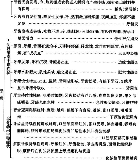 | 释义 | 牙痛 牙痛是十分常见的症状。牙痛绝大多数是由于牙齿疾病中龋齿和牙周疾病引起的,其中以龋齿的继发病牙髓炎和根尖周围炎最为普遍。除牙源性感染外,亦有因其他疾病引起牙痛症状的,如三叉神经痛、上颌窦炎引起的牙痛,或颌骨骨髓炎、颌骨肿痛所致的牙痛。以上牙痛具有各自的特点,可参阅以下牙痛诊断思路: 【诊断思路】