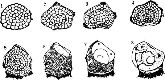 图12-1 牡蛎幼体的发生 1.囊胚期 2、3.原肠期 4.担轮幼体期 5.面盘形成 6-8.D形幼体期 6.生长 牡蛎的生长有两种类型。一类是生长在数年内完成的,如近江牡蛎,生长两年后,最大可达15cm,3周年最大达20cm。以后每年继续生长,但一般3龄个体已达收获规格。另一类生长是在1年内完成,如褶牡蛎,贝壳的生长基本上在第一年内完成,以后几乎不再生长。虽然每年都能繁殖,但体型已经固定。 牡蛎生长有季节性的变化,特别是生长期较长的种类。在南海近江牡蛎壳的生长旺季在秋冬季,农历10月中至翌年1月中生长最快;软体部的生长旺季是春季,即2月中至4月下旬,此时最饱满并将进入繁殖盛期。 表12-3 4种牡蛎胚胎发生的时间