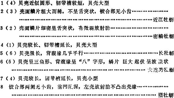 | 释义 | 牡蛎养殖 一、我国沿海牡蛎的主要经济种类 牡蛎的种类很多,全世界有100多种,我国约有20种。其中已经养殖的经济种类有5种。它们是近江牡蛎(Ostrea rivularis)、长牡蛎(O.gigas)、褶牡蛎(O.plicatula)、大连湾牡蛎(O.talienwhanensis)和密鳞牡蛎(O.denselamellosa)。 我国沿海牡蛎经济种类检索表