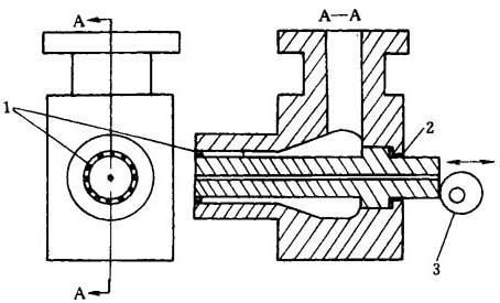 图17-12 用于制造圆周方向定向的塑料管的旋转式芯模的管材模头 1-后轴套 2-主动齿轮 3-轴承 径向定向管材对液体和气体的抗渗透性更高。这使得这种制品可以作为隔离材料,用于仪器和设备包装上。 径向定向管的另一个应用可作为热收缩包装用。 (二)多孔和不同壁厚的塑料管 多孔塑料管是通过轴向模头由销钉和芯模制得的。在图17-13中,芯模装备了一系列液体间歇停留装置。采用销钉在流体流动方向上进行来回摆动可以制成管材壁带有孔的管材。