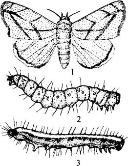 图7-9 犁纹丽夜蛾 1.成虫 2~3.幼虫 【生活习性】 在成都1年发生5代以上。以老熟幼虫在土中筑土茧越冬。翌年4月成虫羽化,产卵于嫩叶上。第一代幼虫于5月上旬始见,5~9月为幼虫为害期。低龄幼虫喜在枝条顶端取食嫩叶,大龄幼虫食量大增。幼虫老熟入土化蛹。末代幼虫于9月下旬陆续入土越冬。 【防治方法】 初孵幼虫群集嫩叶上为害时,剪去虫叶杀灭幼虫。发生严重时,选喷90%敌百虫1000倍液,或20%氰戍菊酯3000倍液,或2.5%溴氰菊酯4000倍液。 |