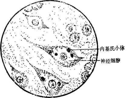 图2-16 狂犬病内基氏小体 病理组织切片检查:脑组织触片检查不能获得阳性结果时,可将脑组织作成病理切片,观察有无内基氏小体。 2.荧光抗体法。通过组织触片或冰冻切片,用荧光抗体染色,观察到胞浆内出现黄绿色荧光颗粒者即为阳性。 3.动物接种试验。将病犬的脑组织制成10倍乳剂,脑内接种4周龄内小白鼠,每只0.03毫升,若接种10-20天内小鼠出现麻痹等神经症状,即可确诊。 (二)鉴别诊断 病初症状不明显的狂犬病,易与犬瘟热出现的神经症状相混同,其区别是犬瘟热以幼犬为多发,各粘膜呈急性粘液性炎变化。皮肤上往往有脓疱疹。无攻击人畜的现象。 【处理】 1.狂犬病目前尚无特效药物治疗。对病犬或疑似狂犬病的病畜,应采取不放血的方法扑杀,尸体深埋或焚毁。 2.家畜如被狂犬病病犬或疑似狂犬病的病畜咬伤,在咬伤后未超过8天,但未发现狂犬病状者,可以屠宰,其肉尸、内脏应经高温处理后利用。超过8天者不准屠宰,按病畜处理。 3.在本病常发地区应动员群众不养犬,扑杀野犬。对犬定期进行疫苗接种是防制本病发生的主要措施。 |