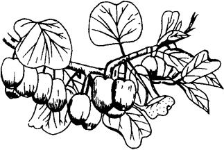 图2-201 猕猴桃 (1)植物学特征。猕猴桃,猕猴桃科,猕猴桃属,落叶藤本植物。主根发达,形成簇生根群。幼枝密生棕黄色柔毛,叶圆形或长圆形,先端圆形、有时渐尖,基部心形,边缘有细锯齿,表面暗绿色,背面生灰白色绒毛,花杂性,多为雌雄异株,聚伞花序,3~6朵花组成,花色由乳白色变橙黄色,有香味,浆果卵形,黄褐绿色,花期5~6月,果期10月。 (2)对环境与土壤的要求。猕猴桃喜温暖、阳光、较耐寒。是既怕旱、又怕涝的灌木性藤本落叶果树。因此在果园建立时应选择排水良好,土壤疏松、灌水方便的低丘或平原地建园。山地建园,坡度应小于20度,在土层深厚、富含有机质的砂壤土上建园最好。盆栽时,取其肥沃、疏松的果园土、菜园土,施入一定的基肥即可。 (3)施肥技术。盆栽施肥,主要是在开花前后和果实膨大期,注意追施氮磷钾含量较高的有机肥(发酵后)或化肥2~3次。对猕猴桃园内的施肥,一般全年施肥3次,其中基肥1次,追肥2次。①对于1~2年生的幼树,追肥应掌握少量多次的原则。前期20~30天施1次,后期2~3个月施1次。全年667平方米施肥量折合纯氮10千克,五氧化二磷5千克,氧化钾8千克。②结果树的施肥,全年667平方米施纯氮15~20千克,五氧化二磷7~10千克,氧化钾10~15千克,其中基肥以有机肥为主,于采果后至落叶前施,每株10~15克,追肥一般在落花后一周左右和7月份壮果期施用。 |