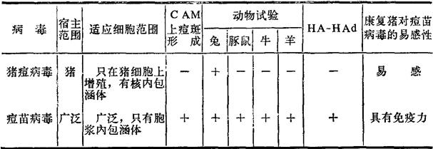 | 释义 | 猪痘病毒属 本属只有猪痘病毒一个成员,不能在鸡胚中传代,在猪肾、睾丸、猪胚肺和脑的细胞培养中盲传几代后即可适应生长。 猪痘病毒主要感染幼猪,特别是乳猪。痘病变发生于腹下部和前后肢的内侧,偶见于背部和腹侧。猪虱和其他昆虫是本病的机械传播媒介。切片检查可见病变部上皮增生,除胞浆内包涵体外,还出现由细丝状物组成的核内包涵体,核空泡化。在细胞浆内还能形成大晶体,直径达800nm,为其他痘病毒所无。 痘苗病毒也可引起猪痘,在病原鉴定上要注意区分。 表38-9 猪痘病毒与痘苗病毒的主要区别