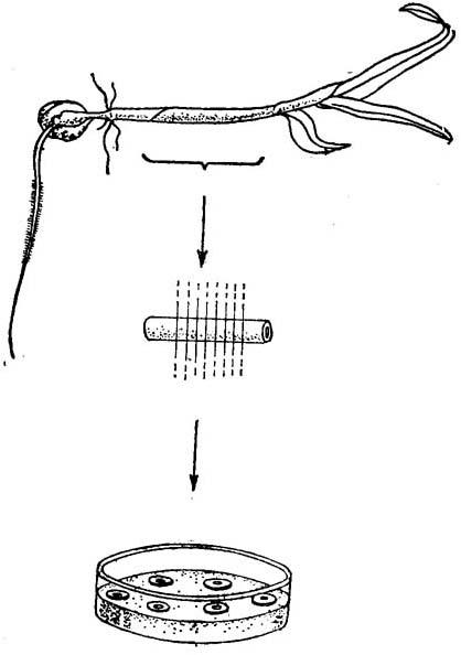 图17-2 试管授粉和颖果培养用母穗制备各阶段 (10)直接胚珠授粉的有效培养基是B11〔Norstog,(1973)和Green与Phillips(1975)〕,附加400mg/1 CH和28.9μM GA。 2.从不同外植体诱导愈伤组织培养物 无论基因型为何,幼苗芽(茎、叶)或根外植体相对易于产生“生根型”培养体。可是,只有少数基因型(见玉米愈伤组织培养的进展一节)可能建成松散细胞培养体。 (1)用次氯酸钠(2.5%w/v加几滴清洁剂)表面消毒干种子15min,强烈振荡,无菌蒸馏水淋洗3次。(0.01%w/v氯化汞也有效)。 (2)将经表面消毒的种子放入无菌蒸馏水中(水深刚能盖着种子)振荡过夜。 (3)重复步骤1。 (4)种子分开接种在无荷尔蒙培养基上(约5ml),放在150×25mm培养皿中。 (5)光下发芽5-6天,直到幼苗达3叶期。 (6)取幼苗第一节上方1cm切段(图17-3),切成厚1mm小片。