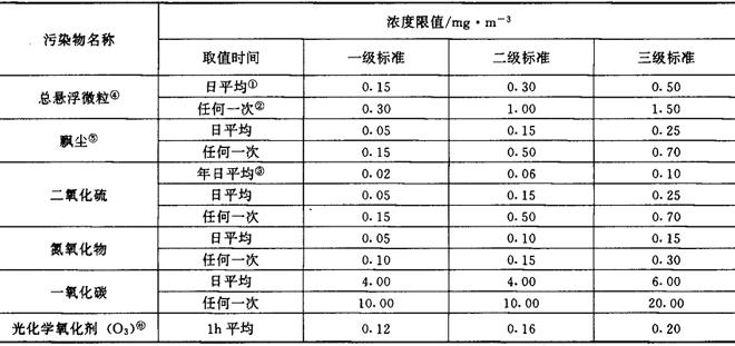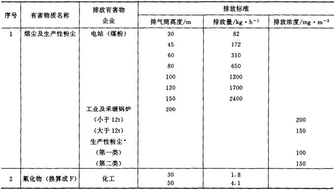 注:①“日平均”为任何一日的平均浓度不许超过限值。 ②“任何一次”为任何一次采样测定不许超过的浓度限值。不同污染物“任何一次”采样时间见有关规定。 ③“年日平均”为任何一年的日平均浓度均值不许超过的限值。 ④总悬浮微粒(T.S.P),系指100μm以下微粒。 ⑤飘尘,系指10μm以下的微粒,该项为参考标准。 ⑥光化学氧化剂(()3),1h均值每月不得超过一次以上。 (3)工业企业有害物质排放标准,见表10-4-14。表中未列其有害物质的排放量,可参照本表类似企业。表中所列数据,按平原地区,大气为中性状态,点源连续排放制订。间断排放者,若每天多次排放,其排放量按表中规定;若每天排放一次而时间又少于1h,则烟尘及生产性粉尘、二氧化物,氟化物等物质的排放量,可为表中规定的3倍。详见GBJ4-13《工业“三废”排放试行标准》。 表10-4-14 工业企业有害物质排放标准