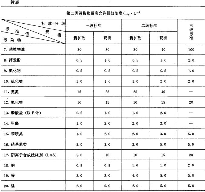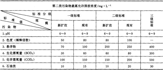 注:*系指局部除尘后所允许的排放浓度。 第一类指含10%以上的游离SiO2或石棉的粉尘、玻璃棉和矿渣棉粉尘,铝化物粉尘等。 第二类指含10%以下的游离SiO2的煤尘及其他粉尘。 (4)污水综合排放标准见表10-4-15,详见GB8978-88。 表10-4-15 污水综合排放标准