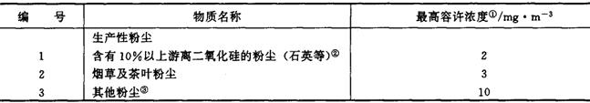(二)职业安全卫生 1.一般规定 (1)严寒地区、寒冷地区的食堂宜采用连廊与生产厂房相连接。厂区内宜设置倒班宿舍。生产车间可设置休息吸烟室。宜按《工业企业设计卫生标准》中的多尘环境进行浴室设计。 (2)宜根据卷烟生产特点设置全厂性的医务部门,特别要注意防治上呼吸道感染、眼疾及由噪声引起的心血管系统疾病。应设妇女卫生室。宜设全厂性的幼托哺乳设施。幼托哺乳设施应设在远离烟尘、烟味发散或能采取有效措施减轻其影响的地方。 (3)应使有毒有害物品的储存及使用符合有关规定。 车间高空作业区应设操作和检修平台或采取其他安全措施。 传动装置的外露部分应设安全防护设施。 (4)生产车间内含尘浓度应符合国家标准。 2.生产车间(场所)有关安全卫生标准 (1)车间空气中有毒物质的最高容许浓度(见表10-4-16)。 表10-4-16 生产车间中有毒空气最高容许浓度