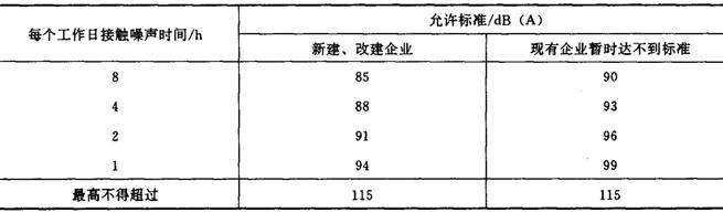 注:①表中最高容许浓度是工人工作地点空气中有害物质所不应超过的数值。工作地点系指工人为观察和管理生产过程而经常或定时停留的地点,如生产操作在车间内许多不同地点进行,则整个车间均算作工作地点。 ②含有80%以上游离二氧化硅的生产性粉尘,应力求达到1mg/m3。 ③其他粉尘系指游离二氧化硅含量在10%以下,不含有毒物质的矿物性和动物性粉尘。 (2)噪声控制标准。 ①我国工业企业暂定噪声卫生标准见表10-4-17 表10-4-17 工业企业噪声卫生标准