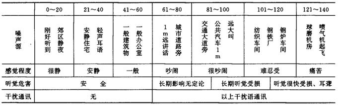 注:国际标准组织噪声标准1964年和1971年进行了修订。 (5)噪声对人的影响程度。 ①噪声与危害对应表,见表10-4-21。 表10-4-21 噪声危害对应表 单位:dB(A)