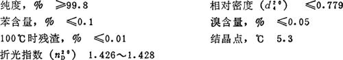 性能 环己烷是典型的环烷烃,具有“船形”和“椅形”两种构型。常温下为无色透明液体,有辛辣刺激气味。沸点80.7℃,凝固点6.3℃,折光指数1.4263,相对密度(d 质量规格(参考)