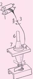 环锭工作示意图1、2.罗拉 3.导纱钩 4.钢丝圈 5.锭子 6.筒管 7.钢领 |